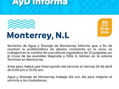 Por. Alicia Flores Agua y Drenaje de Monterrey informó que el suministro de agua se interrumpirá en varias colonias de Monterrey de... Read More