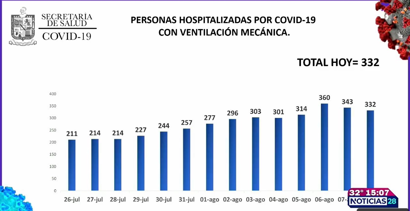 Dijo que al día de hoy, el Estado suma 214 mil 393 contagios y 11 mil 633 muertes a causa del coronavirus durante lo que va de la pandemia y señaló que se registraron 332 pacientes intubados, 11 menos que ayer.