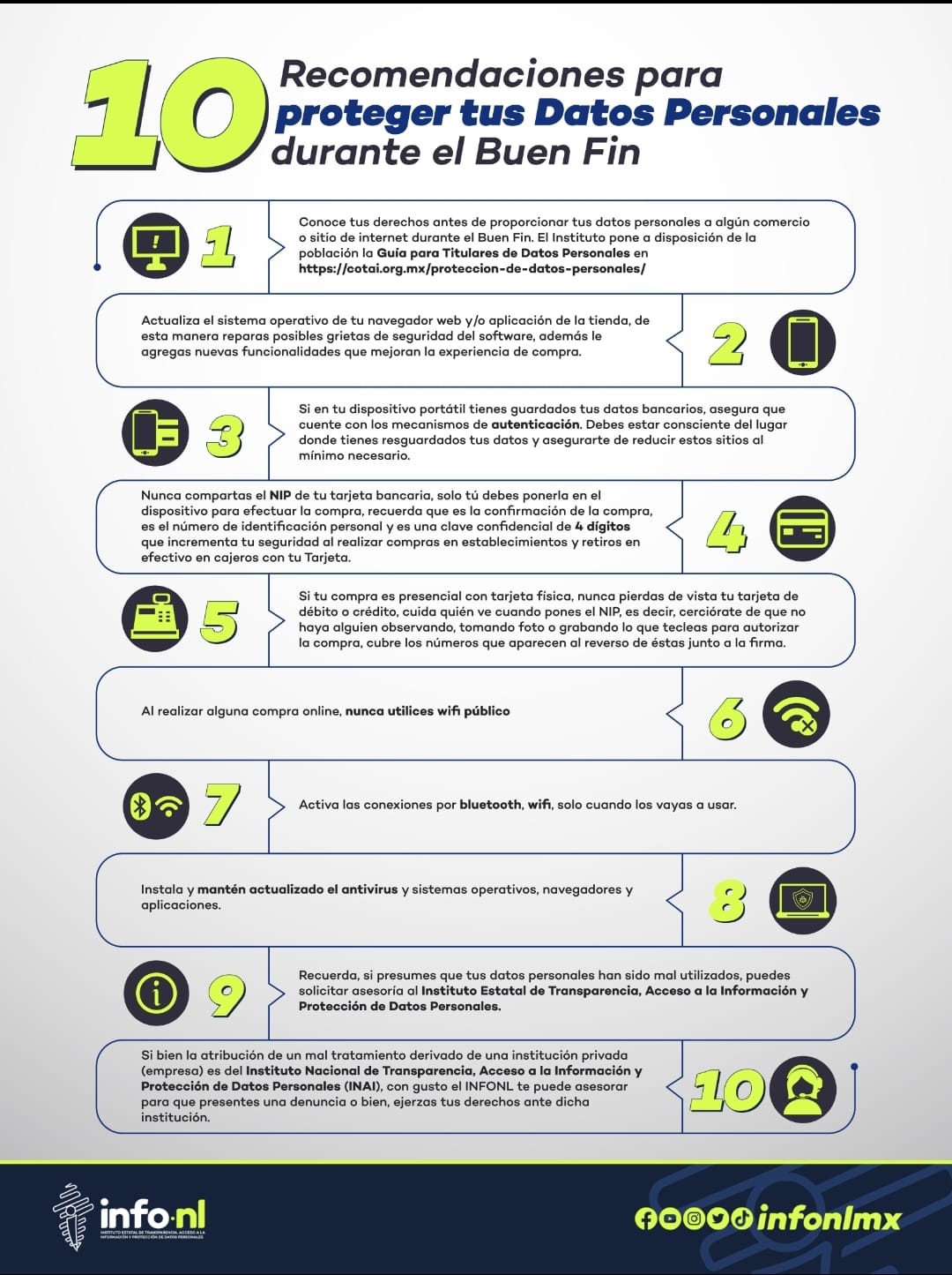 El Instituto Estatal de Transparencia, Acceso a la Información y Protección de Datos Personales (INFONL) emite 10 recomendaciones para proteger los datos personales de los consumidores durante el Buen Fin 2022, que se llevará a cabo del viernes 18 al lunes 21 de noviembre.