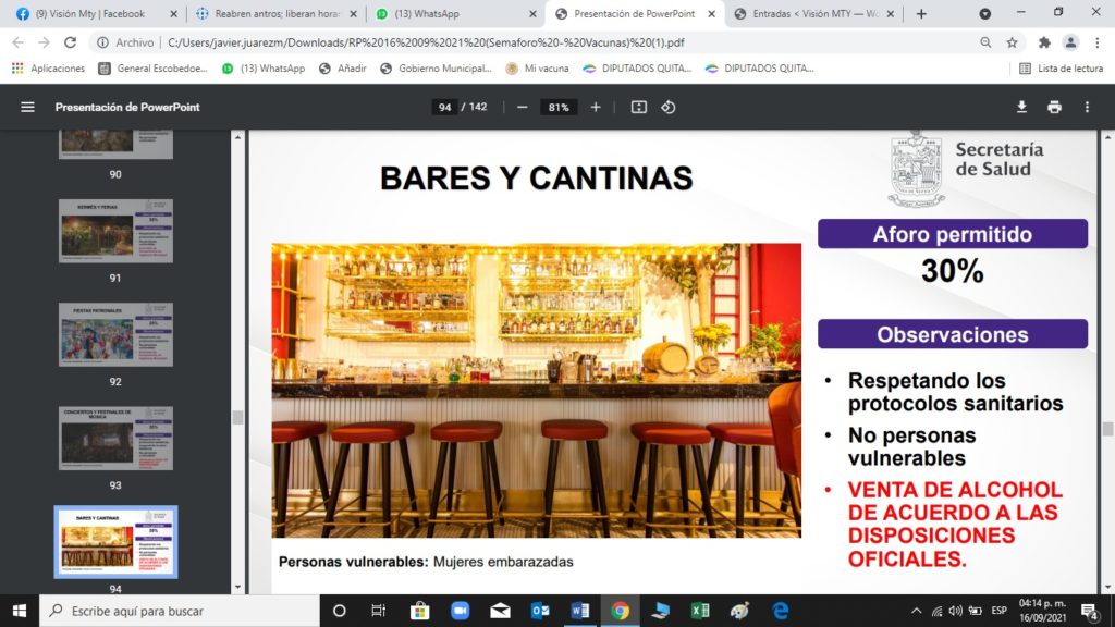 El secretario de Salud en el Estado Manuel a la O. Cavazos anunció que ante la disminución de contagios y hospitalizaciones por Covid-19, se autorizó la reapertura a partir del lunes de giros que permanecían cerrados, como eran antros, bares, cantinas, billares, así como la realización de conciertos, pero solo con un aforo del 30 por ciento.