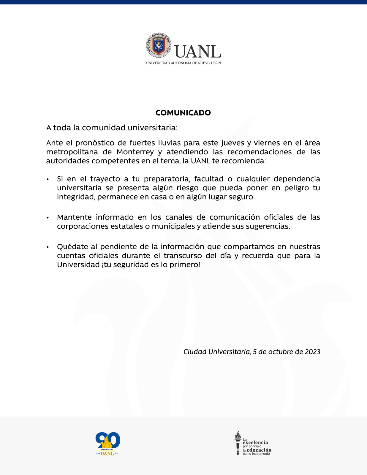En el comunicado se lee si en el transcurso a las instalaciones de la UANL se presenta algún inconveniente recomienda mejor permanecer en casa o en un lugar seguro.