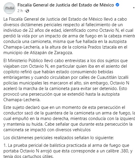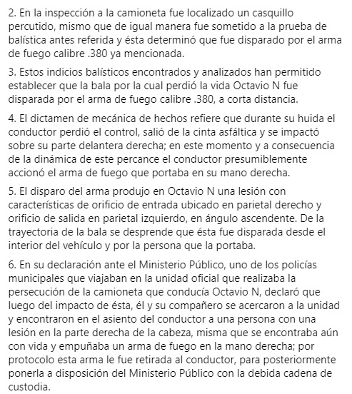 El comunicado concluye con esto: “De los resultados de los dictámenes periciales antes descritos, así como de los testimonios ante el Ministerio Público de los acompañantes del occiso y de los policías municipales que realizaron la persecución señalada, se concluye que a consecuencia del impacto de la camioneta, accidentalmente Octavio N disparó a sí mismo el arma de fuego que tenía en la mano derecha, la bala le impactó en la cabeza y por esta lesión perdió la vida cuando era trasladado al hospital para recibir atención médica”.