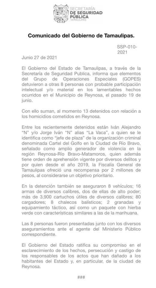 A través de un comunicado el Gobierno de Tamaulipas dijo, a través del comunicado, que con la detención del líder criminal y sus cómplices, suman ya 13 detenidos por los hechos criminales ocurridos en Reynosa.