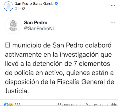 Por su parte el municipio de San Pedro a través de redes sociales se concretó a decir que habían colaborado activamente en la investigación que llevó a la detención de 7 elementos de policía en activo.