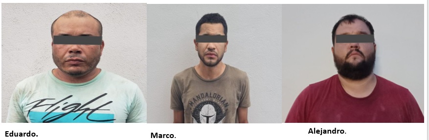 En el lugar fueron detenidos Eduardo de 41 años, Marco Antonio de 26 años y Alejandro Misael de 29 años, a quienes les encontraron vestimenta de Fuerza Civil, tres armas largas calibre .223, un arma corta calibre .40, cargadores abastecidos y 18 envoltorios de mariguana.