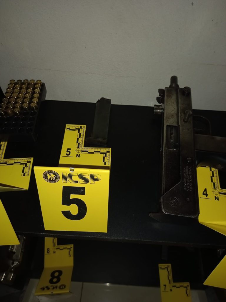 Tras la inspección , agentes del COE de la AEI, encontraron chalecos balísticos, una macana en color negro, dos armas de fuego, cargadores y cartuchos hábiles.