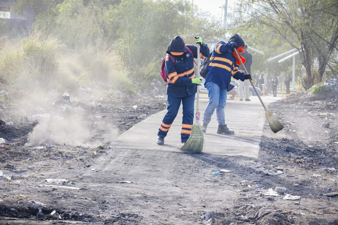 El alcalde Adrián de la Garza supervisó la limpieza de un espacio público en la colonia Barrio Puerta del Sol, de donde se retiraron más de 220 toneladas de desechos que estaban sobre la calle Ocaso.