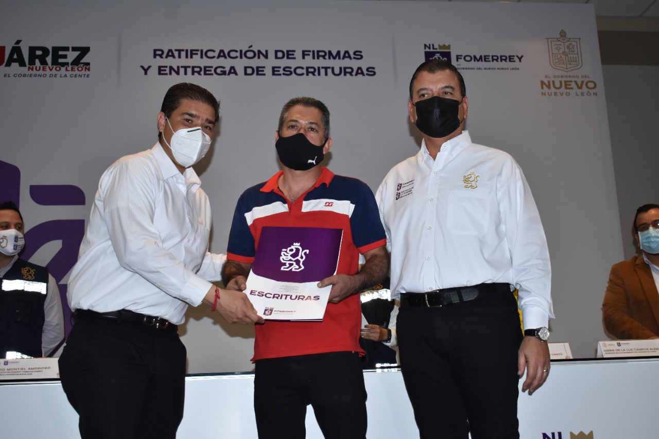 Luego de entregar a más de 300 familias las escrituras de sus viviendas, el Municipio de Juárez y Fomerrey suscribieron un convenio para impulsar la regularización de 6 mil 700 predios más durante la Administración del Alcalde Francisco Treviño Cantú.