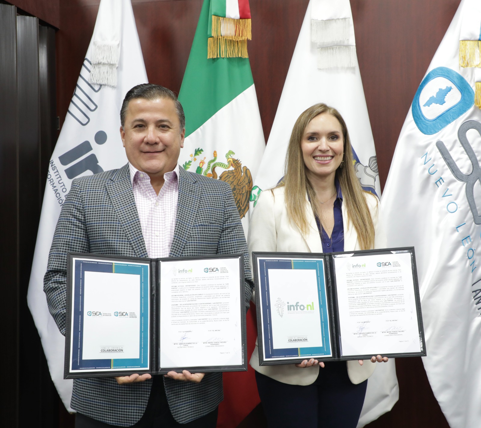 La Consejera Presidenta del INFONL, María Teresa Treviño Fernández, signó el convenio de colaboración con el Secretario Técnico de la Secretaría Ejecutiva del Sistema Estatal Anticorrupción del Estado de Nuevo León (SESEANL), Joaquín Ramírez De La Cerda, con la finalidad de mejorar sus procesos de rendición de cuentas en el ámbito de sus respectivas competencias y capacidades.