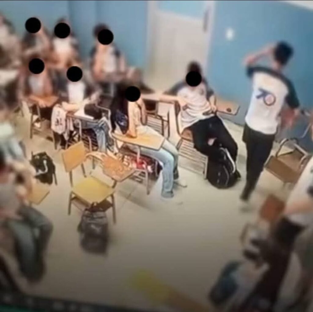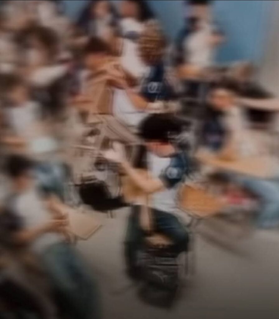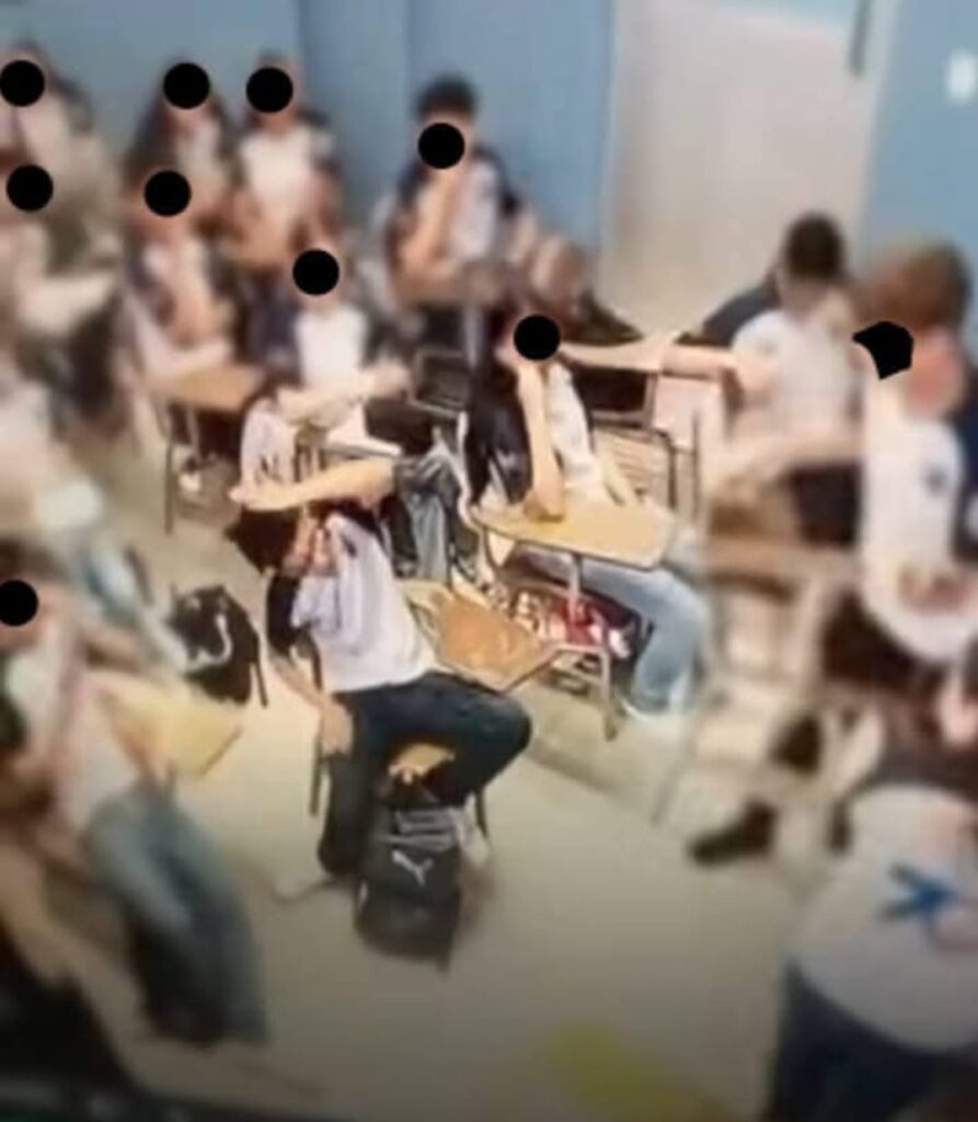 En un video difundido en redes sociales, se logra apreciar como el compañero levanta el pupitre y no alcanza a elevarlo lo suficiente para evadir la cabeza de su compañero que se encontraba delante de el y le propina el golpe.