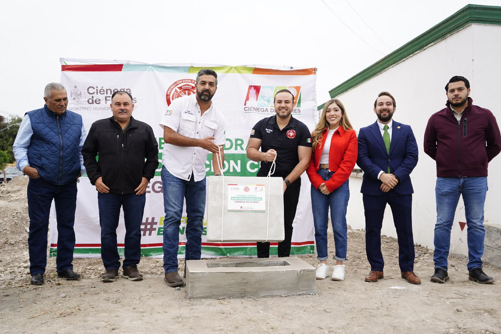 Autoridades municipales, empresarios y representantes de la sociedad civil participaron en la colocación de la primera piedra de lo que será la próxima base de operaciones de Protección Civil y una estación de Bomberos, en el municipio de Ciénega de Flores.
