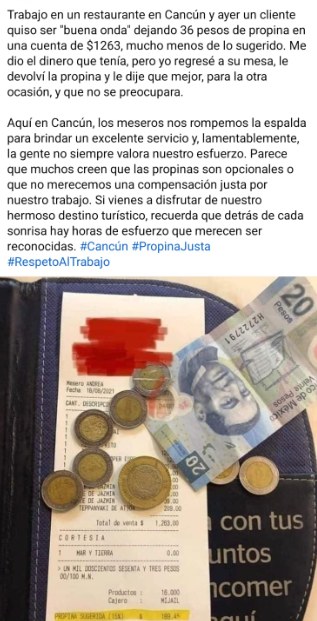 Un mesero de un restaurante de Cancún regresó la propina que le dejó un comensal porque no le dejó el “mínimo sugerido” de acuerdo a su consumo.