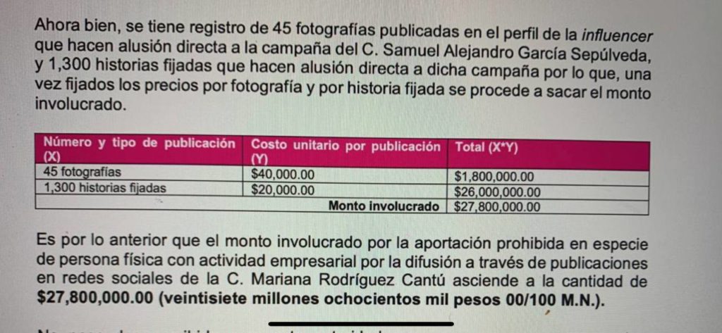 Según una notificación que le hicieron llegar a Sepúlveda García se le informa que “se tiene registro de 45 fotografías publicadas en el perfil de la influencer que hacen alusión directa a la campaña del C. Samuel Alejandro García Sepúlveda y 1,300 historias fijadas que hacen alusión directa a la dicha campaña por lo que, una vez fijados los precios por fotografía y por historia se procede a sacar el monto involucrado”