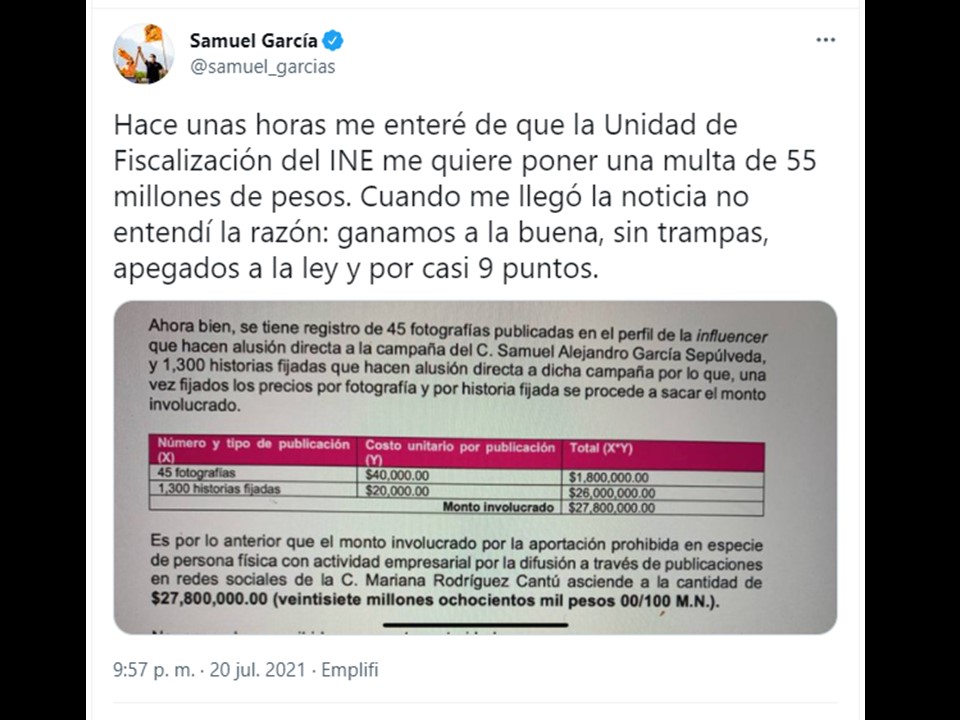 La Unidad de Fiscalización del INE impuso una multa al gobernador electo de Nuevo León, Samuel García por las publicaciones que hizo en sus redes sociales su esposa e influencer Mariana Rodríguez Cantú.