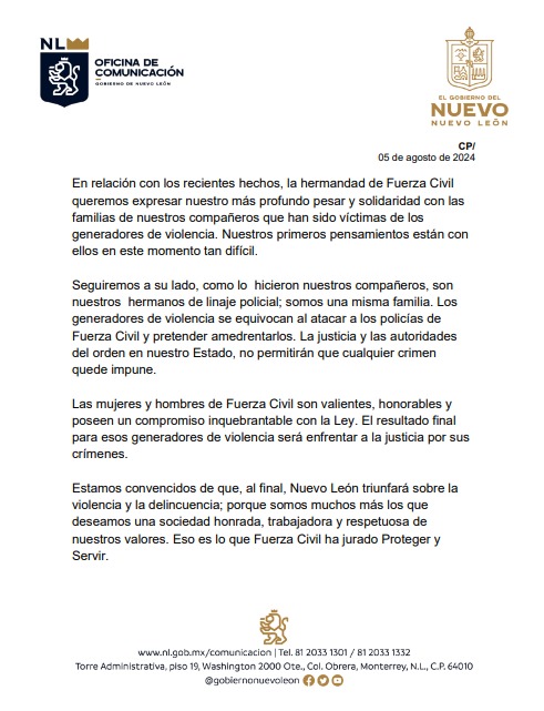 “Las mujeres y hombres de Fuerza Civil son valientes, honorables y poseen un compromiso inquebrantable con la Ley. El resultado final para esos generadores de violencia será enfrentar a la justicia por sus crímenes” indica el comunicado.