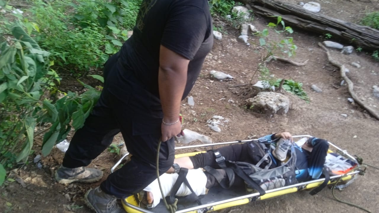 La víctima, identificada como Elizabeth, de 59 años y originaria de Saltillo, Coahuila, pertenece a un club de senderismo y se encontraba de paseo cuando resbaló y cayó de su propia altura, resultando con una fractura expuesta de su tobillo izquierdo.