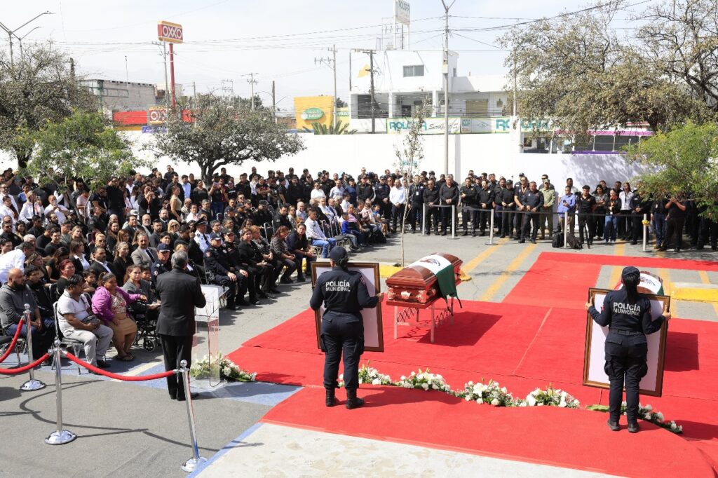 El Alcalde Héctor García García acompañado del Secretario de Seguridad Pública, Alfredo Fabela, y de familiares de los elementos caídos, dieron el último adiós a los policías abatidos la mañana del domingo en la colonia Luis Donaldo Colosio.