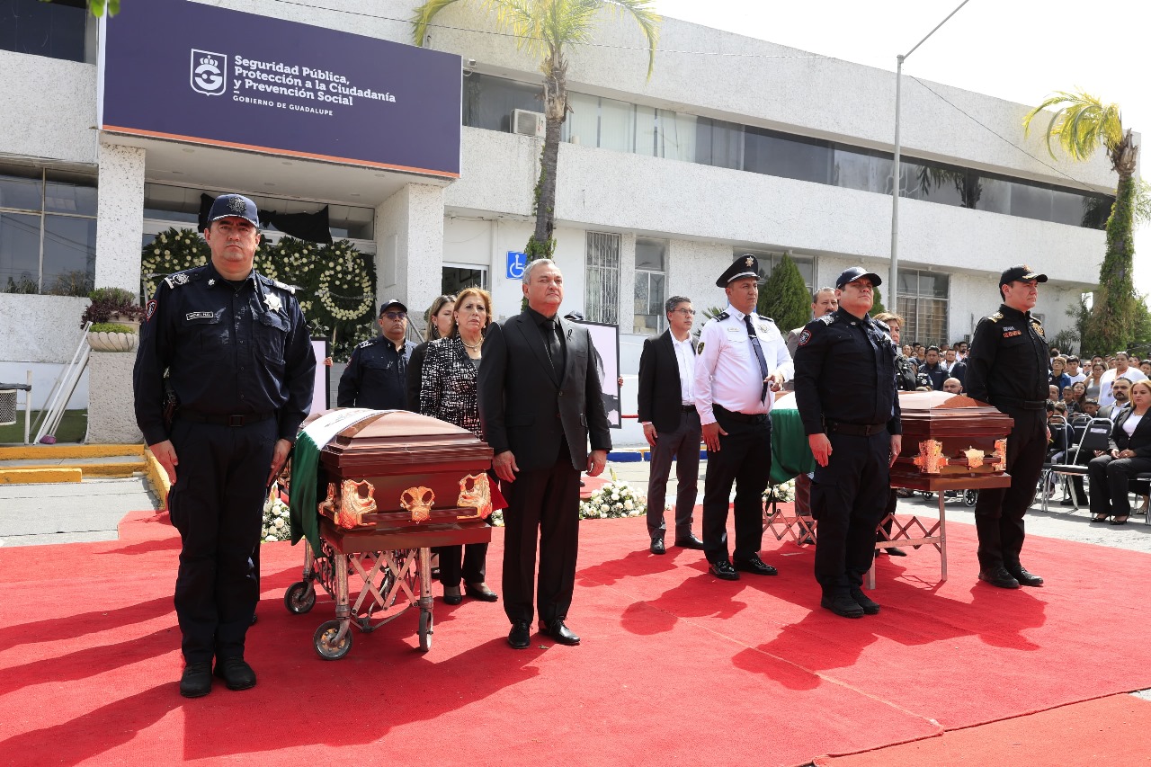 Los oficiales José Eduardo López Campos y Francisco Montero Pérez, murieron sirviendo y velando por la integridad y seguridad de los guadalupenses, por ello reiteramos el respaldo total a sus familias, expresó el Edil guadalupense en el homenaje realizado en la Secretaría de Seguridad Pública municipal.