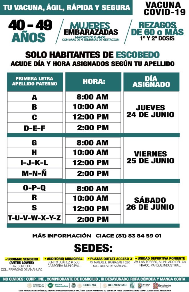Para la aplicación de primera dosis a personas de 40 a 49 años de edad, mujeres embarazadas mayores de 18 años con 9 semanas de gestación y adultos mayores pendientes de primera o segunda dosis, la vacunación será el jueves 24, viernes 25 y sábado 26 de Junio.