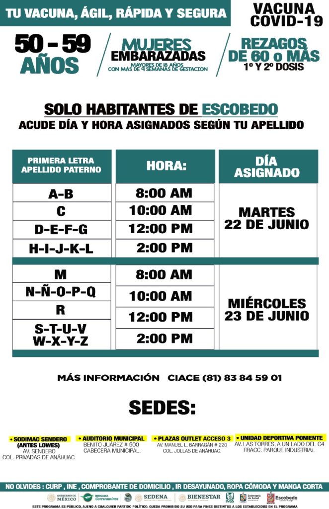Desde el día martes 22 de Junio y hasta el sábado 26, se estarán aplicando las dosis en cuatro sedes establecidas, pues el objetivo es que en Escobedo se vacune a toda la población.