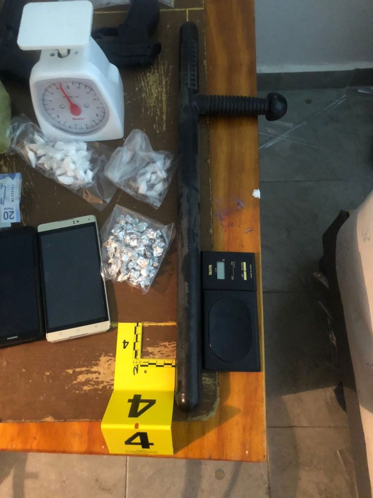 Además: una bolsa de plástico transparente con 31 envoltorios de plástico con sustancia color blanco en su interior, una bolsa de plástico transparente con 7 envoltorios de plástico con sustancia cristalina en color blanco en su interior, una bolsa de plástico color amarillo con hierba verde y seca en su interior, una báscula digital color blanco, dos armas cortas, una bolsa de plástico trasparente con diversos fragmentos de plástico en su interior, varias bolsas de plástico trasparente vacías.